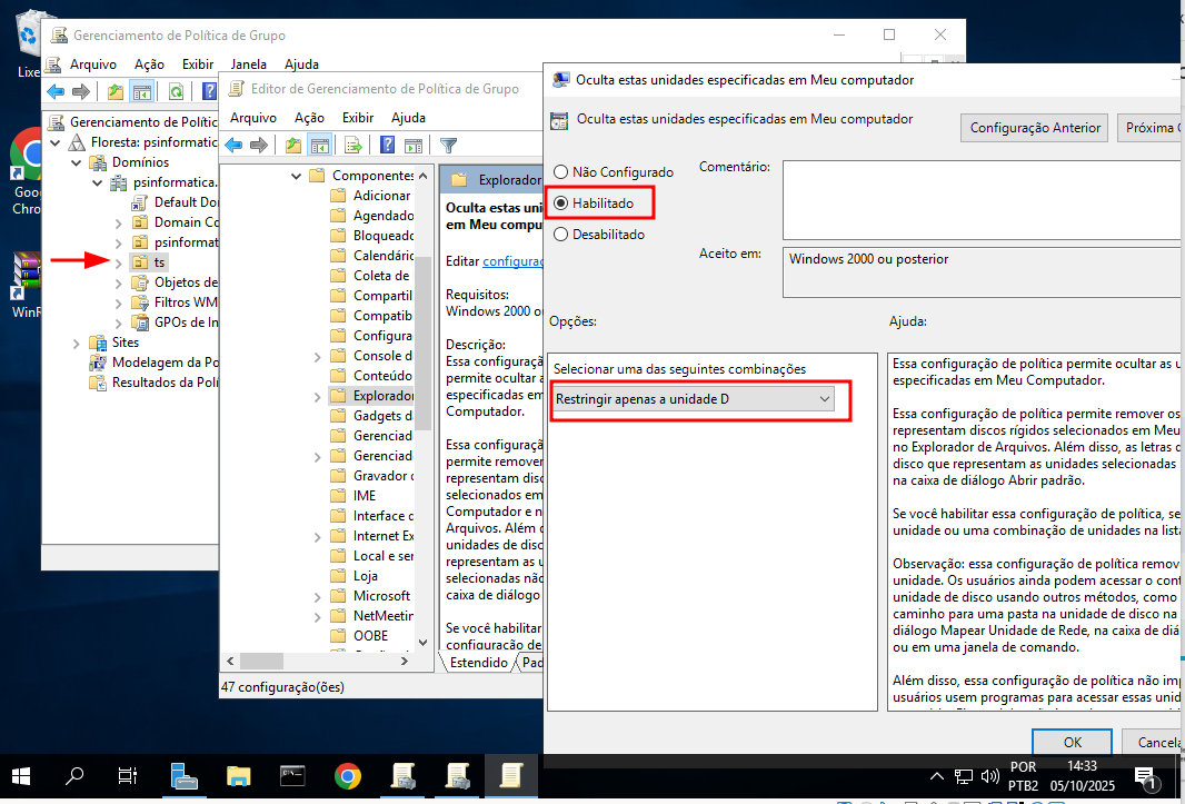 Salve as alterações. As configurações da Política de Grupo serão aplicadas imediatamente, sem a necessidade de reinicialização. A unidade D: ficará oculta da navegação no Explorador de Arquivos.