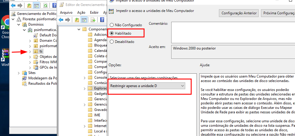 Com esta opção de GPO, você pode ocultar unidades específicas (A, B, C, D) ou todas as unidades de uma só vez. Por exemplo, escolhi ocultar apenas a unidade D:.